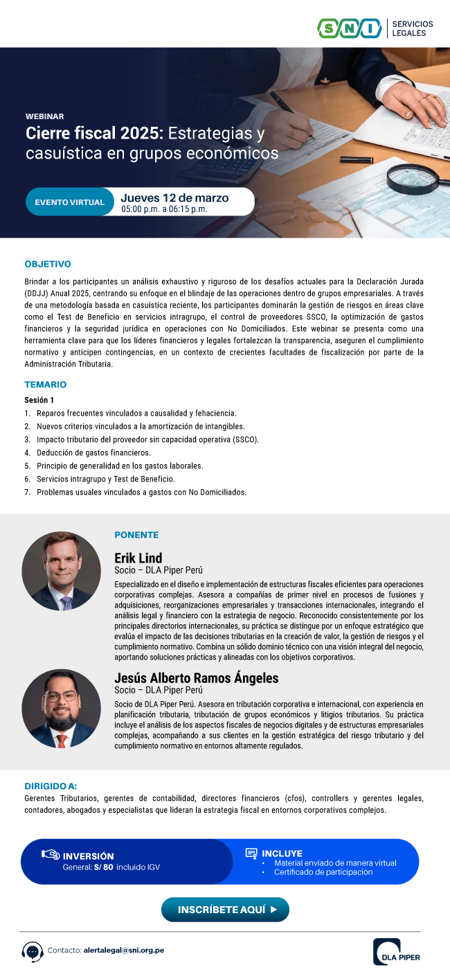 febrero, 2026 Webinar: Cierre fiscal 2025: Estrategias y casuística en grupos económicos 25febDestacadoWebinar: Cierre fiscal 2025: Estrategias y casuística en grupos económicos Detalles del evento Detalles del evento Tiempo(Miércoles) Organizador Servicios Legales - SNI CalendarioCalendario de Google
